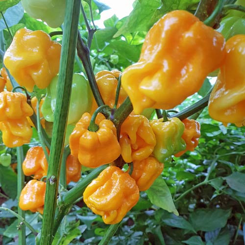 Info: Die Roatan Pumpkin Habanero Chili stammt von der Insel Roatan vor der Küste von Honduras. Es ist eine exotische und sehr ertragreiche Sorte mit leuchtend orangefarbenen Chilis, die einer Minipaprika ähneln und starke Rippen haben. Da die Pflanzen so produktiv sind, kann es nötig sein, die Zweige zu stützen. Die Früchte haben einen sehr fruchtigen Geschmack mit einer intensiven Schärfe. Deshalb eignen sie sich besonders gut für fruchtige Hot Saucen und Salsas, aber auch zum Trocknen.