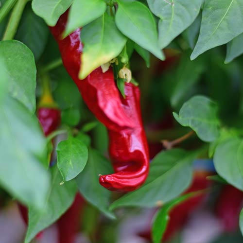 Info: Die Piment d`Espelette Chili ist eine traditionelle und extrem aromatische Sorte aus dem französischen Baskenland. Wenn sie in der Gegend um Espelette angebaut wird, darf sie mit dem Gütesiegel AOC (Appellation d`Origine Contrôlée; kontrollierte Ursprungsbezeichnung) bezeichnet werden. Die buschigen Pflanzen sind sehr ertragreich und die dickwandigen, saftigen Chilis reifen zu einem schönen glänzenden Rot mit ganz milder Schärfe. Profi- und Hobbyköche sowie Gourmets auf der ganzen Welt schätzen das typische Aroma der Piment d`Espelette, die in ihrer Anbauregion vor allem getrocknet und zu dem berühmten aromatischen Pulver verarbeitet wird. Sie eignet sich allerdings auch gut zum frischen Verzehr, zum Einlegen, Kochen, Grillen und Füllen. In Frankreich stellt man aus daraus gerne Pasten (Coulis, Compote), Konfitüre und Senf her.